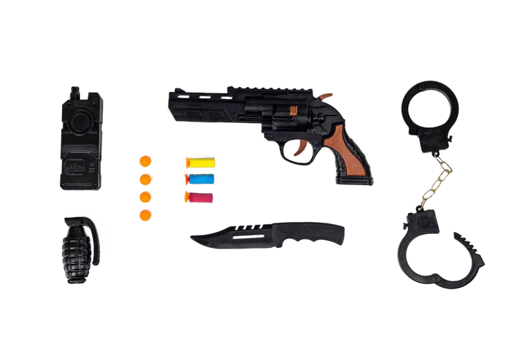 تفنگ هفت تیر، بیسیم، دستبند پلیسی، نارنجک، چاقو پلیس